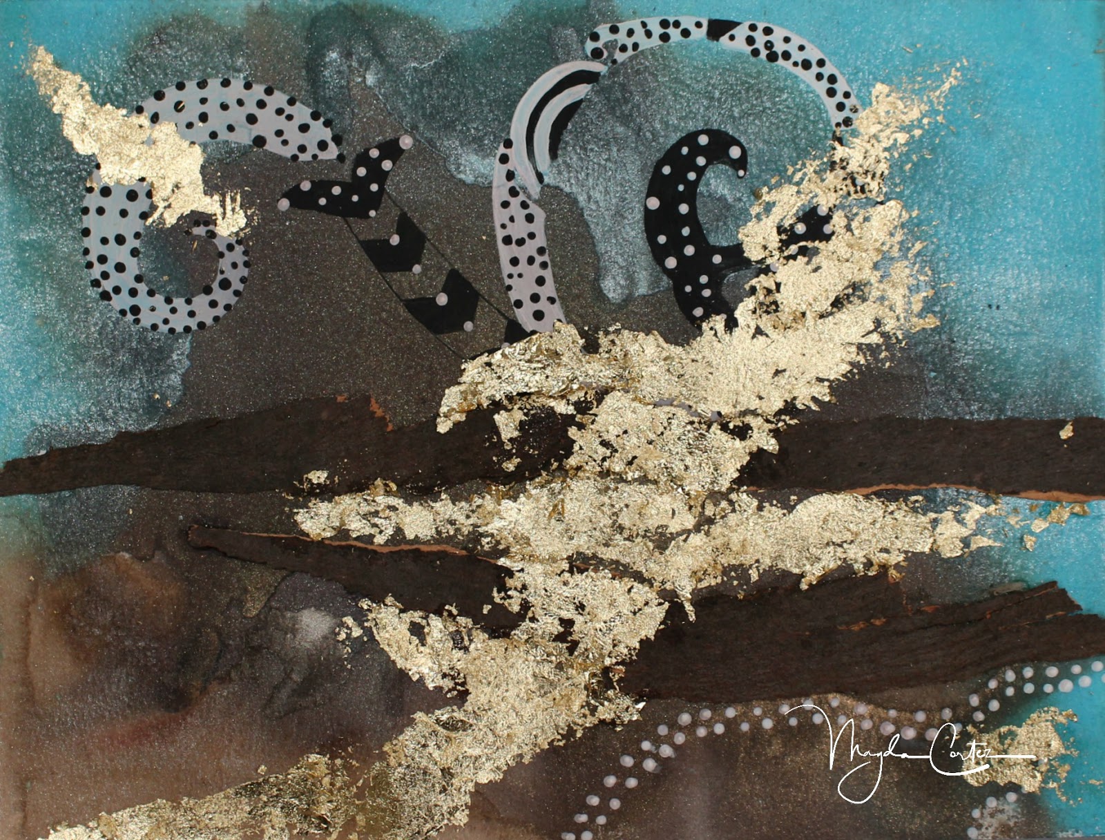 My interpretation...The blue is Rainginui (Sky Father) the brown is Papatuanuku (Earth Mother) the two pieces of bark mean the separation and the gold is the light in to the world.